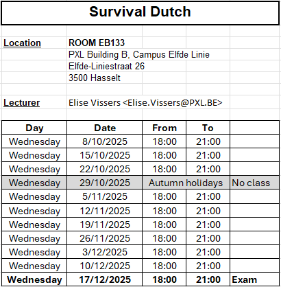 PXL University is a university of applied sciences. This means classes usually have a direct link to practice. Futhermore, all subjects have a component of distance learning. This means, pre-tasks (before coming to class) are to be completed and after class some processing tasks might be expected.